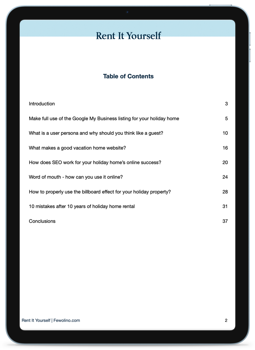 Don’t put all your eggs in one basket – learn how to make sure your vacation property is visible online and attracts the right type of guests. All on your own! No magic formulas, no shortcuts. We show you, step by step, what will make your holiday home thrive online. By implementing the suggested steps in this ebook, you will become more independent from big OTAs (online travel agencies and platforms), like Booking.com, Fewo Direkt (Expedia), AirBnb & co.
